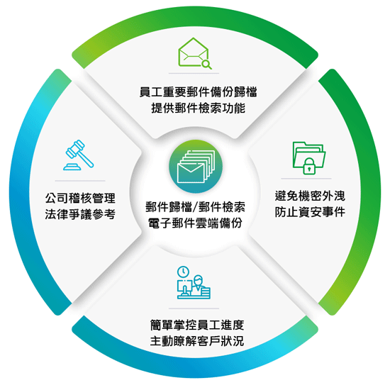 郵件歸檔服務,顧名思義乃將電子郵件備份並歸檔於硬碟空間,因此,郵件歸檔亦可稱之為『電子郵件備份』。郵件歸檔系統,會將同網域所有的『寄出信件』與『收入信件』自動備份於專屬空間,協助企業留存重要郵件、建立知識管理機制以及稽核管理。郵件歸檔的重要性千萬不可忽略,郵件備份之服務,乃: